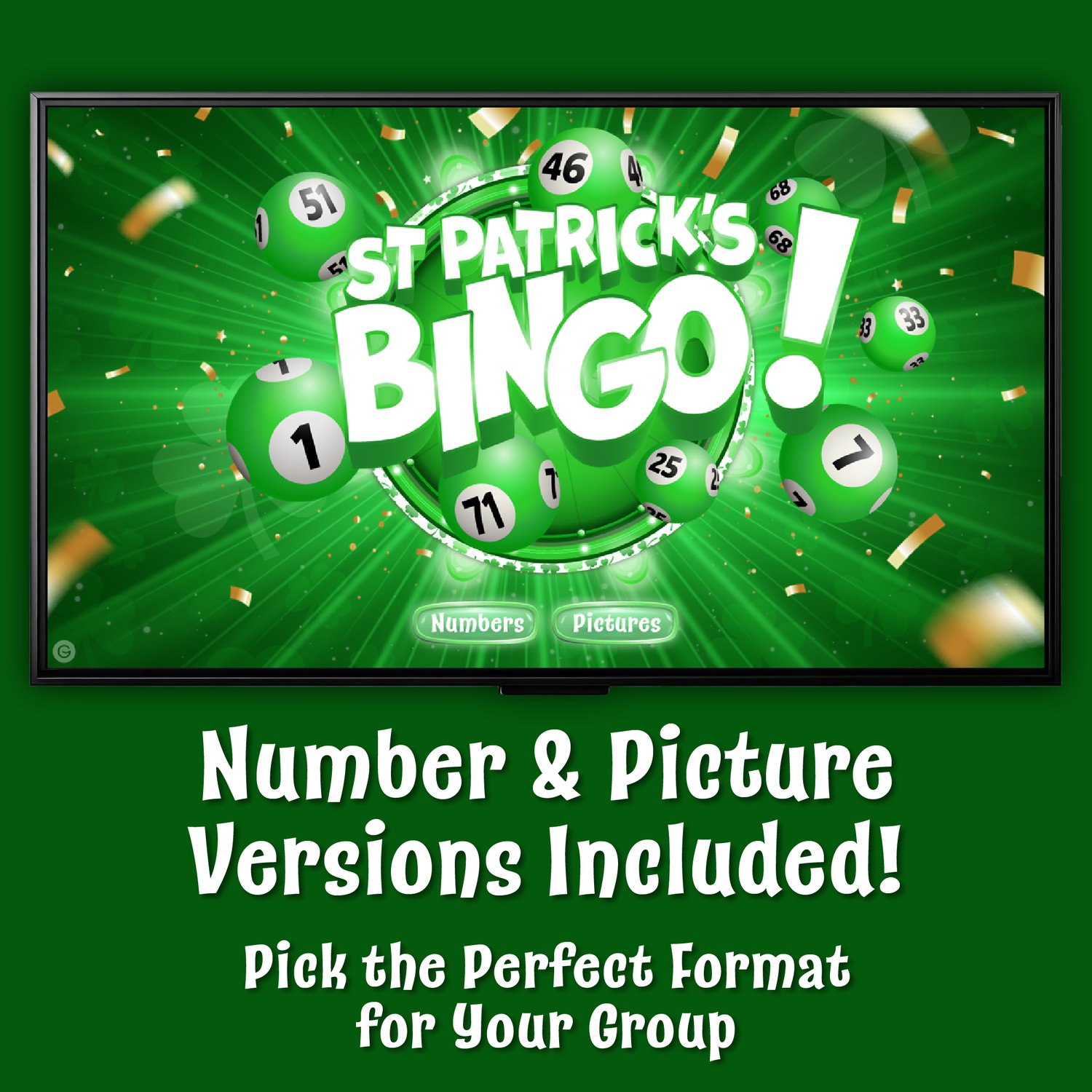 Looking for a fun and easy St. Patrick's Day classroom activity? St. Patrick's Day Bingo includes both picture and number versions, so you can choose the perfect learning focus for your students: number recognition or holiday vocabulary. Featuring animated bingo spinners, St. Patrick's Day-themed graphics, and 50 printable bingo cards for each version, it’s the perfect activity for classrooms, ESL vocabulary practice and warm-up activities throughout March.
