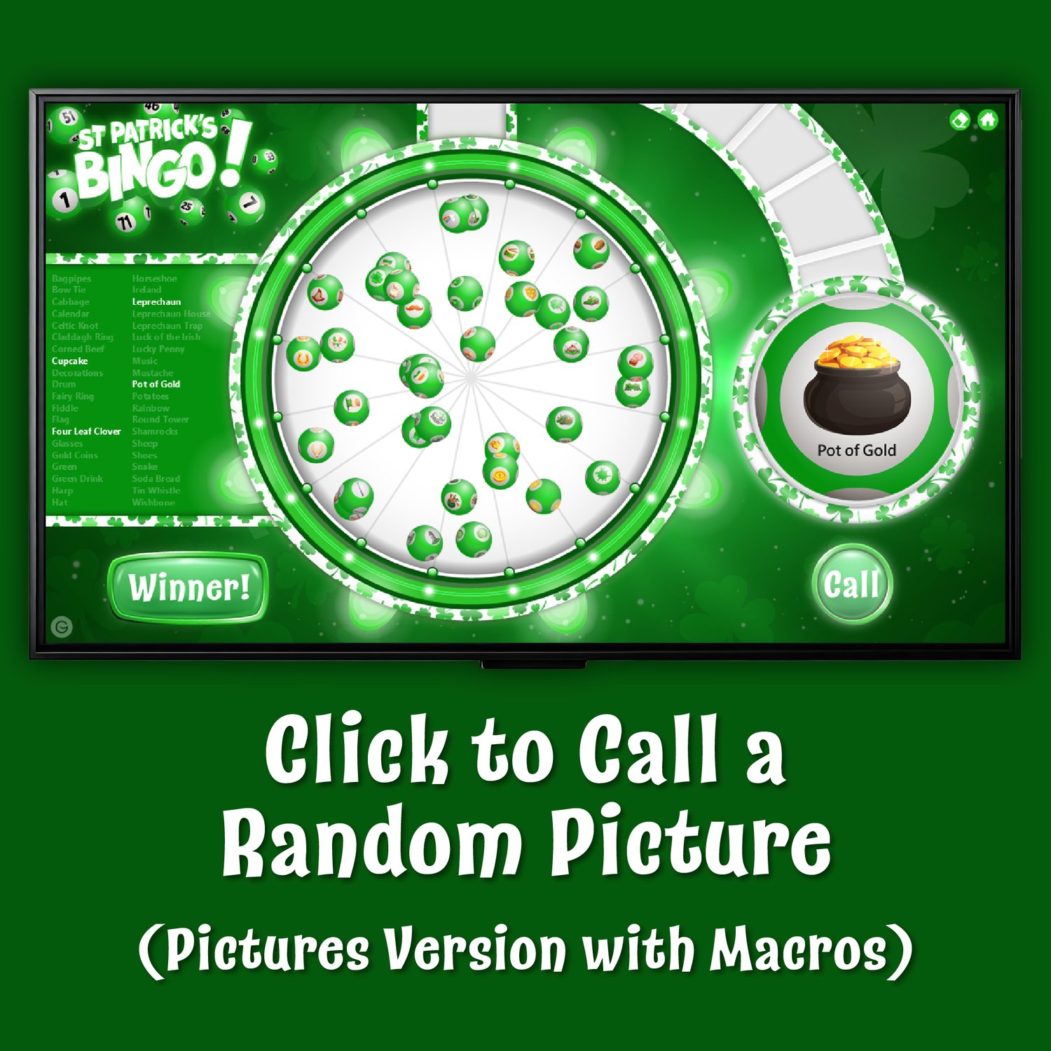 - 2 PowerPoint bingo spinners with random call buttons (macro and non-macro versions included)