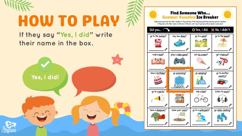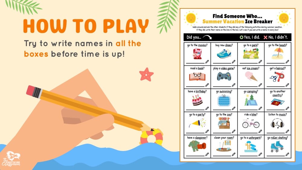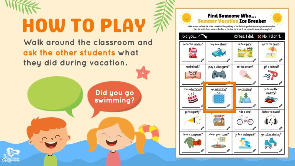 For part one of this activity, students will walk around the classroom and ask the other students if they did any of the activities in the boxes during vacation. If they did, they write their name on the line in the box. The goal is for students to try to write a name in every box before time is up. Feel free to also add a rule about how many times a student can write a single name depending on your class size.