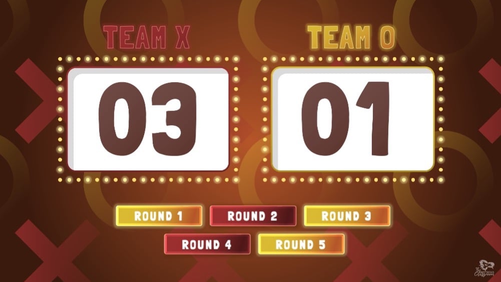 - To win the round, one team either gets three in a row (across, vertical or diagonal) or has 5 squares.