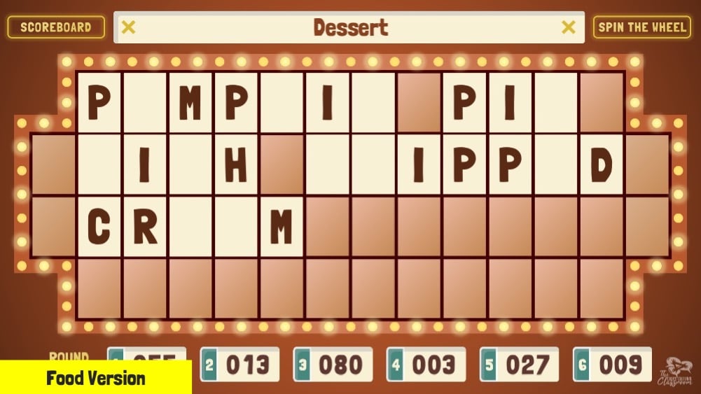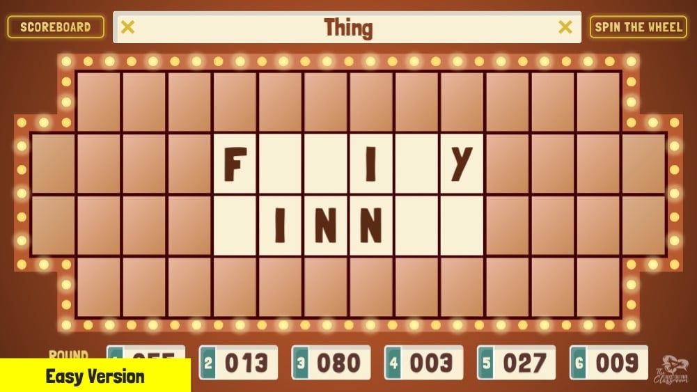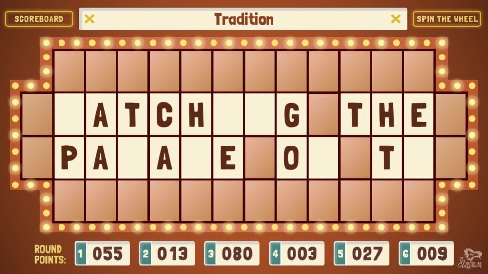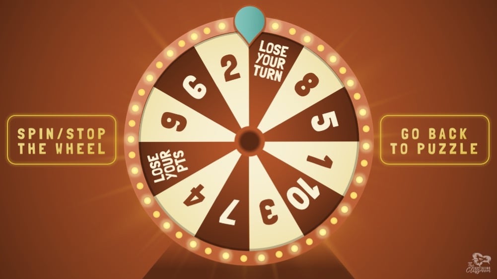 - If they pass, the next student/pair/team does the same sequence: spin the wheel, guess a letter, get points, solve or pass.
