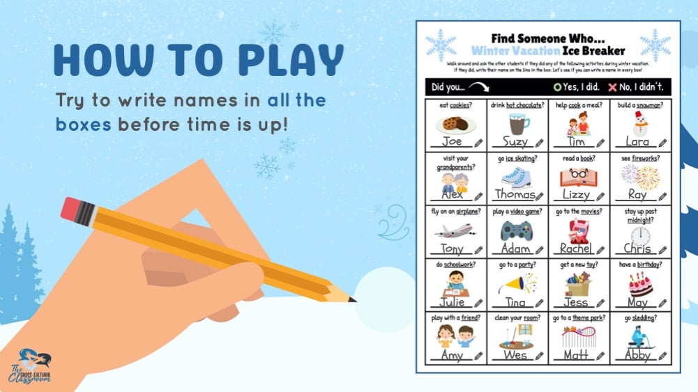 For part one of this activity, students will walk around the classroom and ask the other students if they did any of the activities in the boxes during vacation. If they did, they write their name on the line in the box. The goal is for students to try to write a name in every box before time is up. Feel free to also add a rule about how many times a student can write a single name depending on your class size.