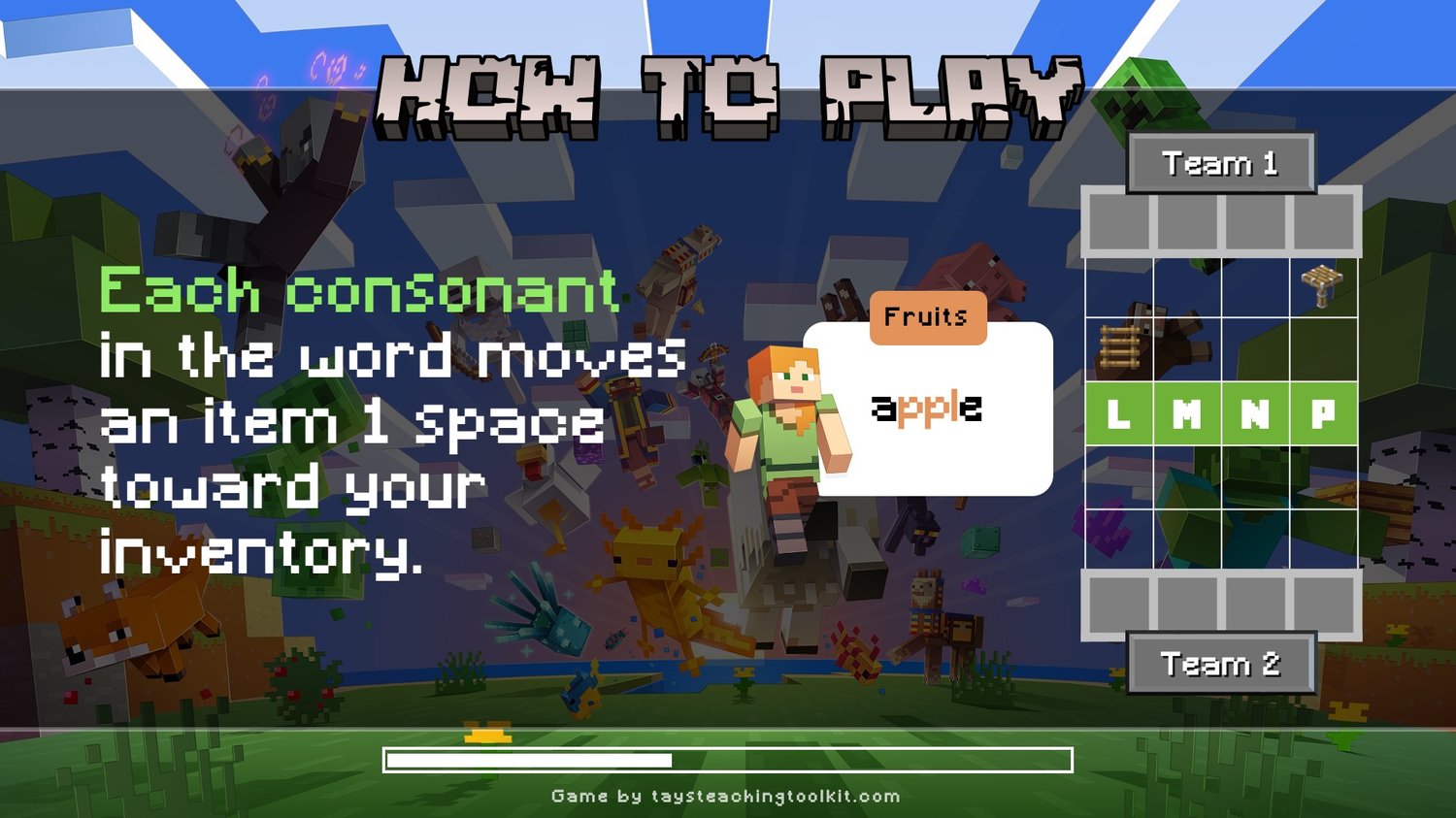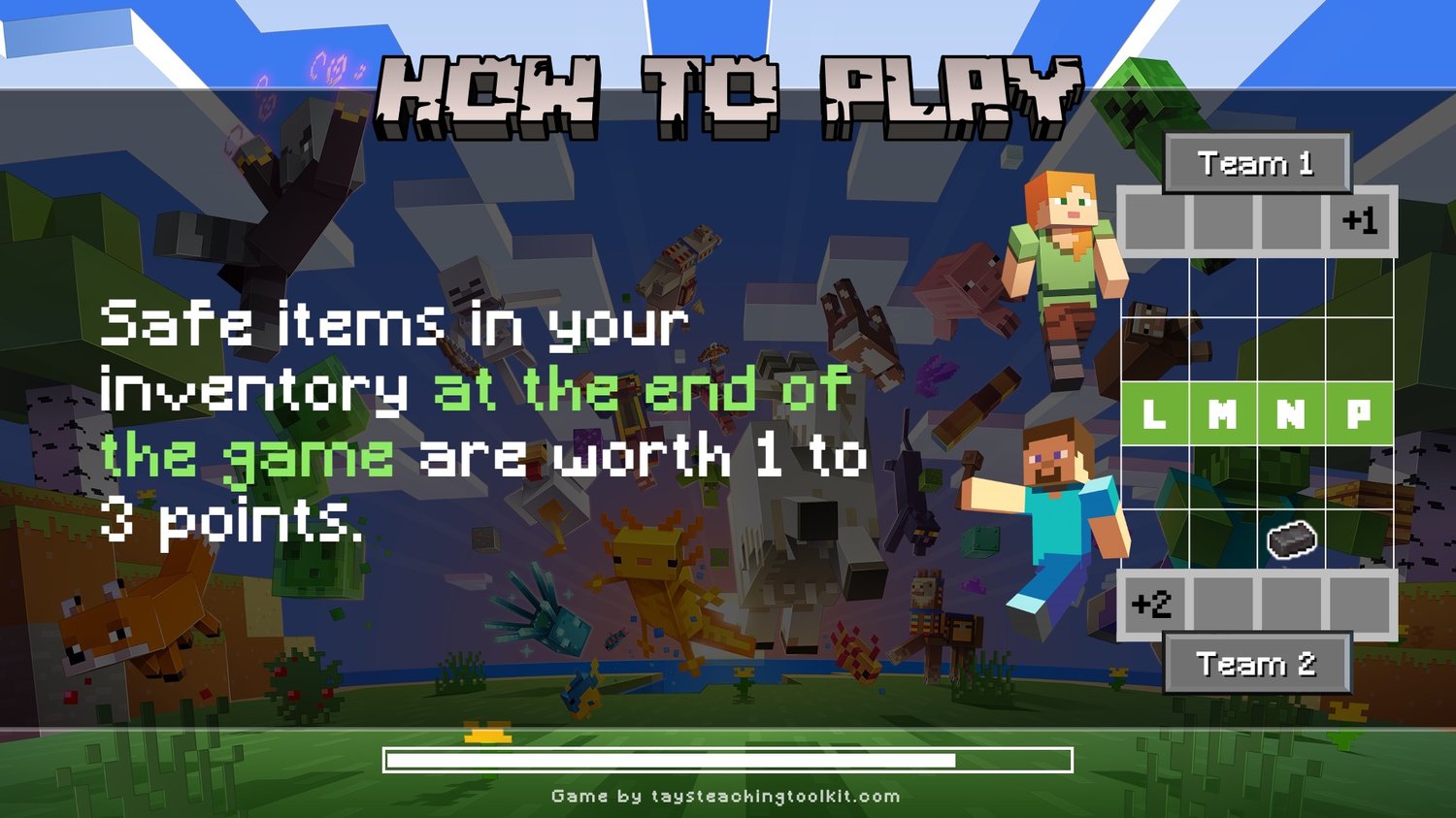 - Set in the Minecraft world with easter eggs for Minecraft fans (i.e. items that match the consonant they represent and point values of items based on their rarity in the actual game)
