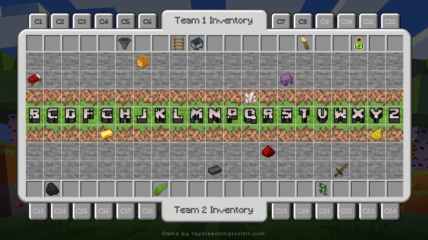 - If an item reaches a team’s inventory box, that team has taken that item, and it can’t be moved back onto the game board. Teams can still write words that include consonants/items that have been taken, but the taken items are not moved.