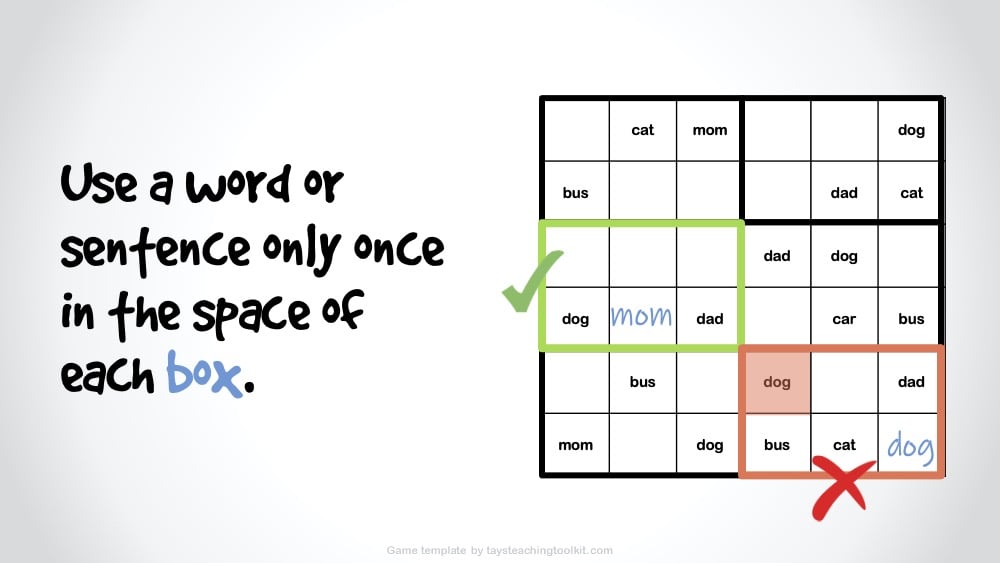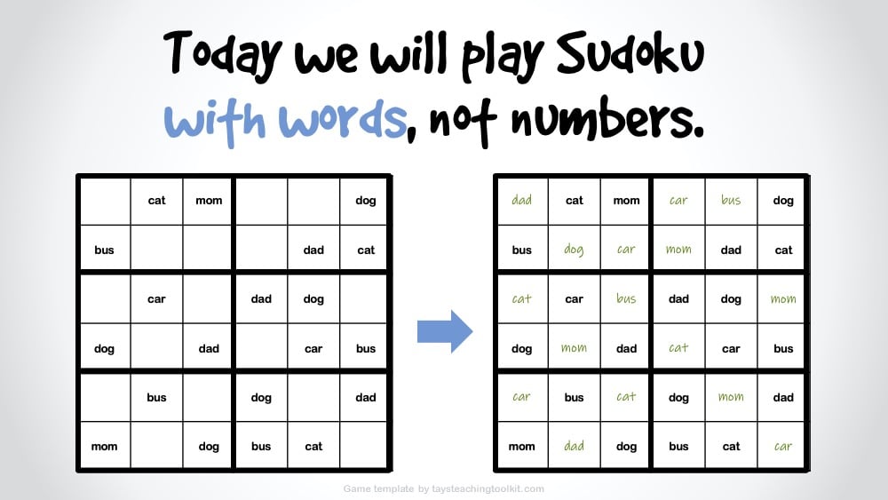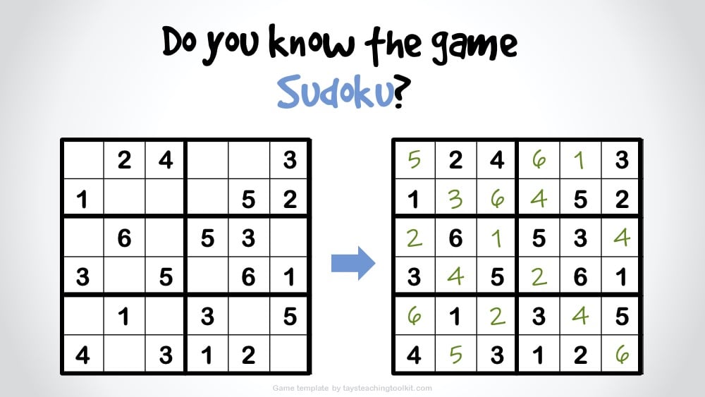 - Or, if using for Zoom classes and students don’t have a copy of the worksheet beforehand, you can put your puzzle on a PowerPoint slide and have students redraw it in their notebooks. Though, I only recommend this for the 4x4 or 6x6 puzzles as the 9x9 puzzle may take too much time.