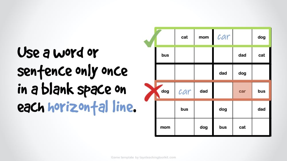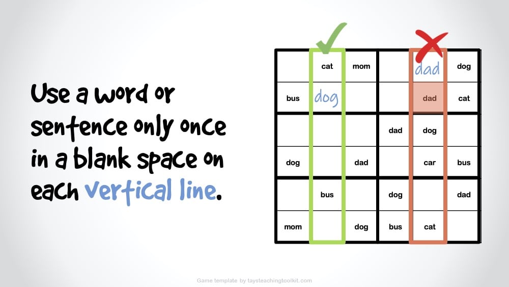 - Then, if playing with words or sentences instead of letters, replace the letters accordingly (EX: A = Word/Sentence 1, B = Word/Sentence 2, C = Word/Sentence 3, etc.)