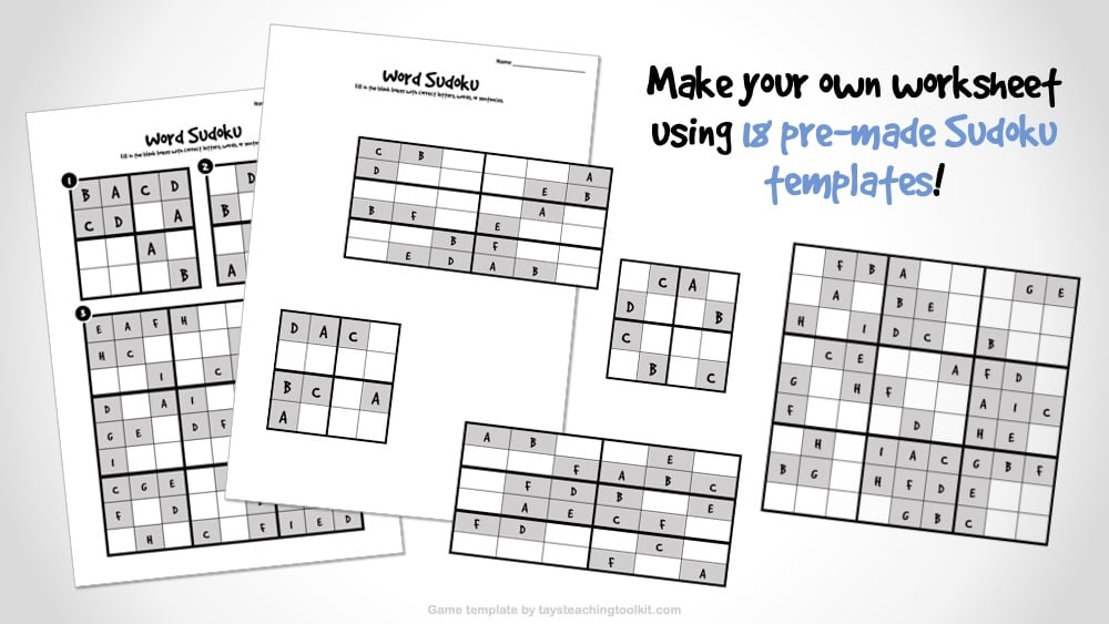 - Worksheet template includes 3 different Sudoku puzzles: 4x4, 6x6, and 9x9 with 6 pre-made versions of each as well as their answer keys