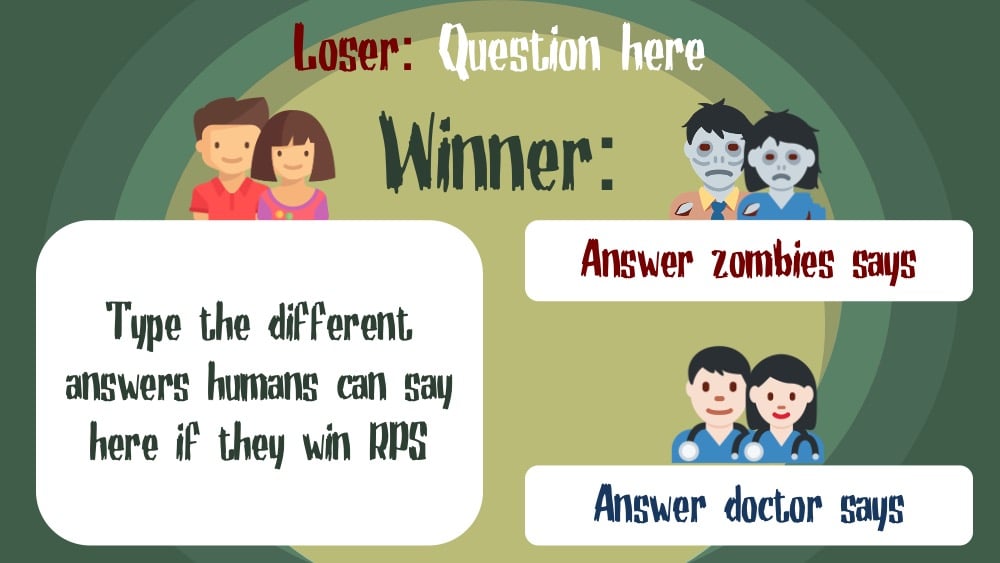- Depending on what the student is (human, zombie, or doctor), they respond with different answers if they win rock, paper, scissors.