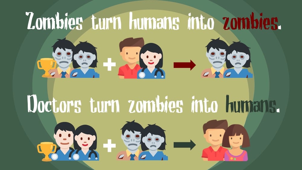 - Zombies turn humans into zombies and doctors turn zombies back into humans, but only if they are the winner of rock, paper, scissors. If a human wins, nothing happens.